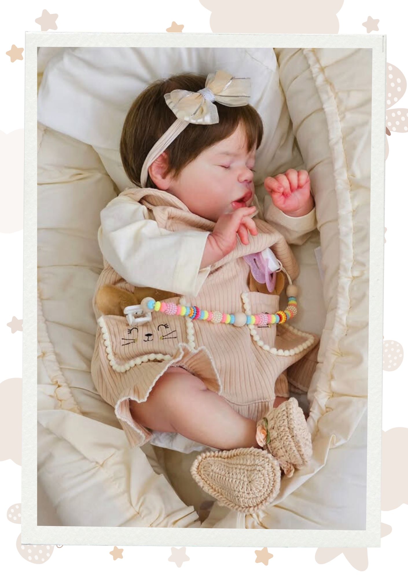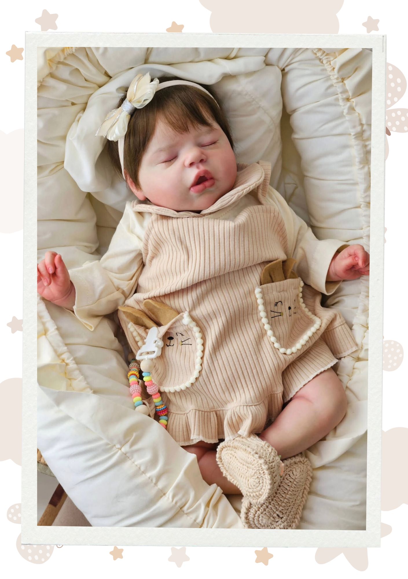Os membros em vinil siliconado garantem um toque realista, e o cabelo implantado fio a fio com mohair reforça a aparência natural. Você também pode personalizar características como a cor dos olhos e do cabelo, deixando sua bebê ainda mais especial.